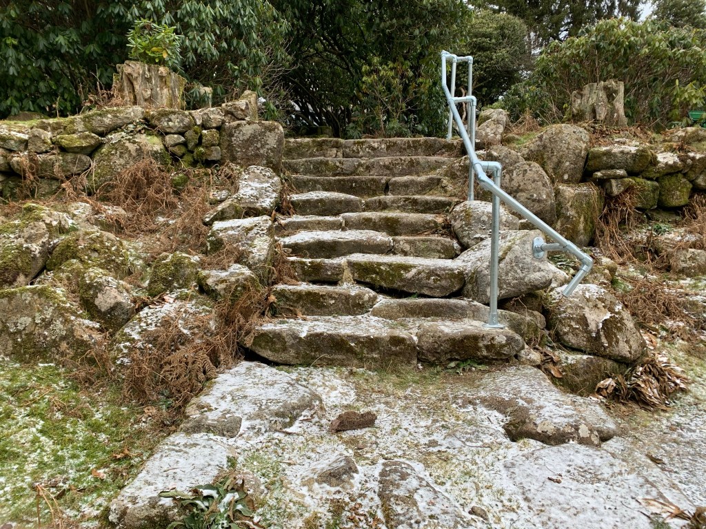 Now after four years of soul searching we have eventually got around to providing a handrail to the ancient granite steps at the bottom of the garden. This is our final task of Risk Mitigation. We have used a kit for galvanised tube system to provide a reliable, handrail that will not rot of rust in the harsh Dartmoor environment. We also hope that this addition does not detract from the beauty of the granite structure also constructed around 1930.